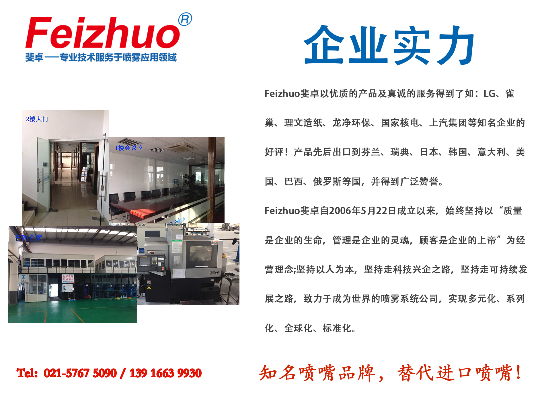 噴嘴廠家,F(xiàn)eizhuo斐卓公司,是一家致力于噴霧控制和環(huán)境科技的綜合型大型噴嘴加工廠!公司有自己的研發(fā)中心,銷售團(tuán)隊(duì),售后服務(wù)體系!集現(xiàn)代化的先進(jìn)設(shè)備和檢測(cè)儀器于一體,大型生產(chǎn)工廠,規(guī)范化管理,生產(chǎn)的噴嘴產(chǎn)品應(yīng)用于各行業(yè),主要以替代進(jìn)口為主!且出口歐美、日本、馬來(lái)西亞、印度尼西亞、俄羅斯等國(guó)!